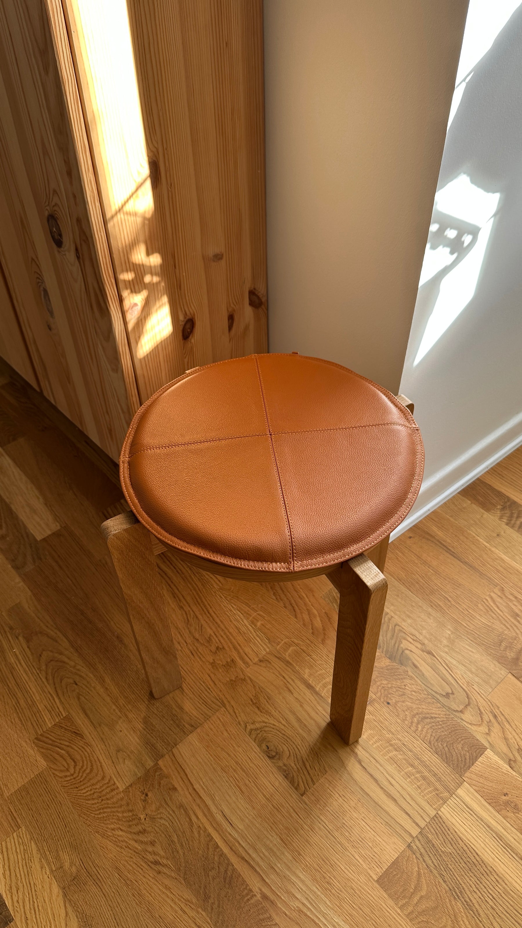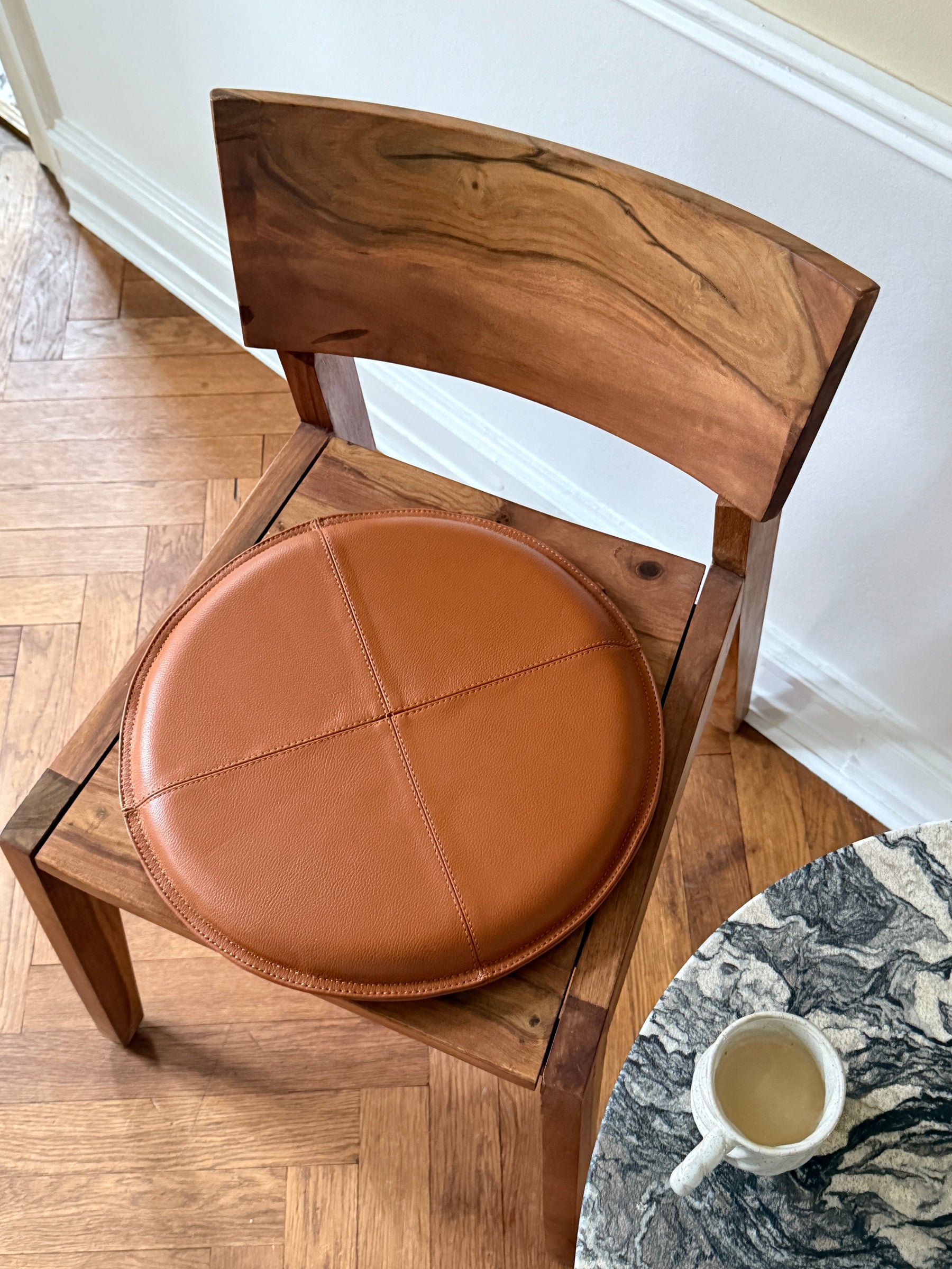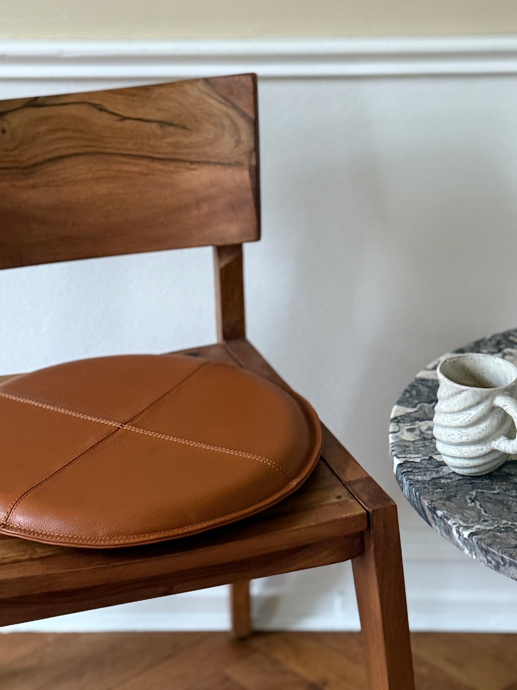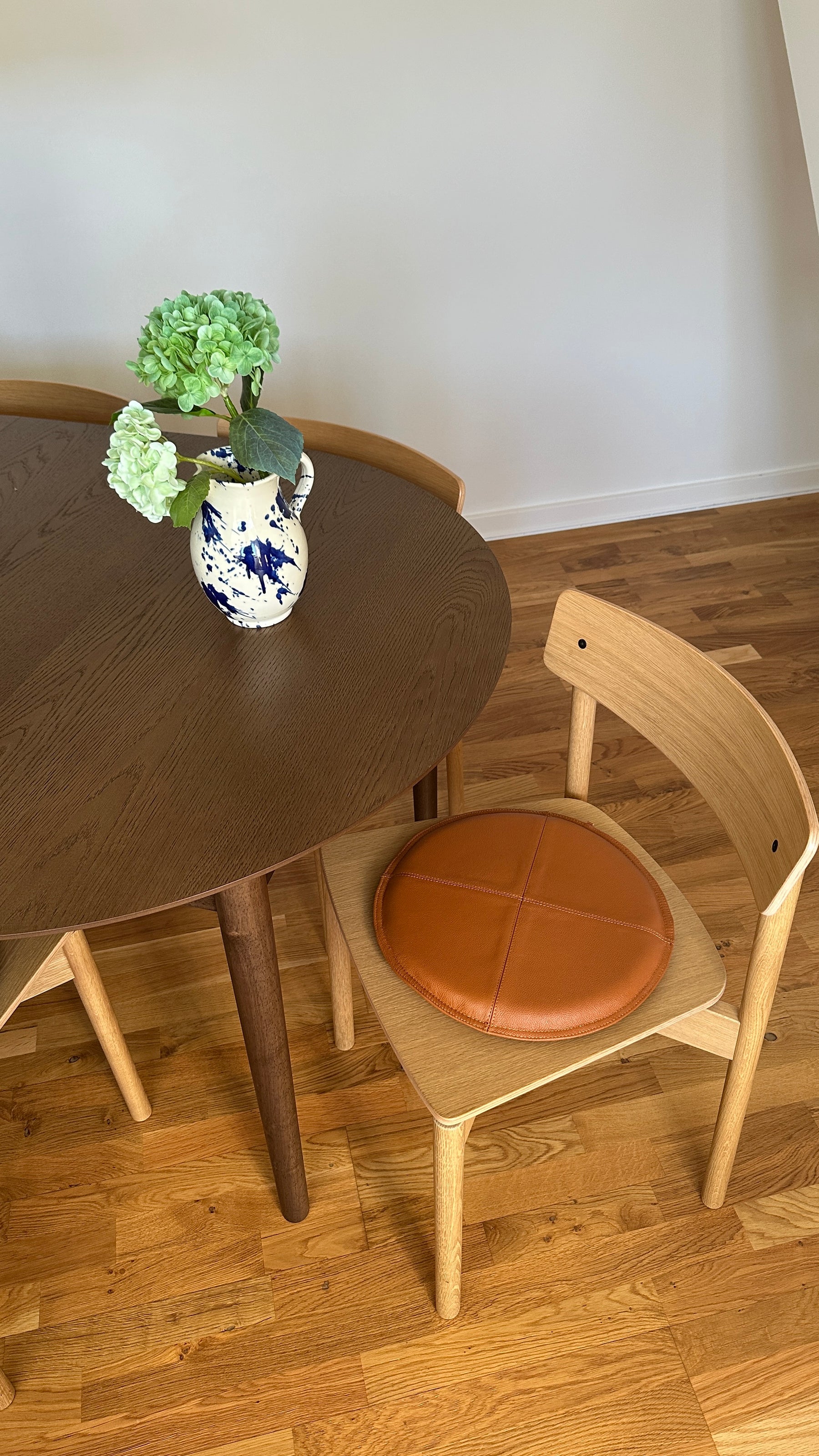 Rund skindpude i cognac tilfører varme og elegance til enhver indretning. Den smukke cognacfarve fremhæver skindets naturlige struktur og giver et eksklusivt udtryk, der passer perfekt til både klassiske og moderne hjem. Puden er ideel som siddekomfort på spisebordsstole, bænke eller som dekorativ detalje i stuen. Det ægte koskind bliver kun flottere med tiden og tilføjer karakter og dybde til rummet.