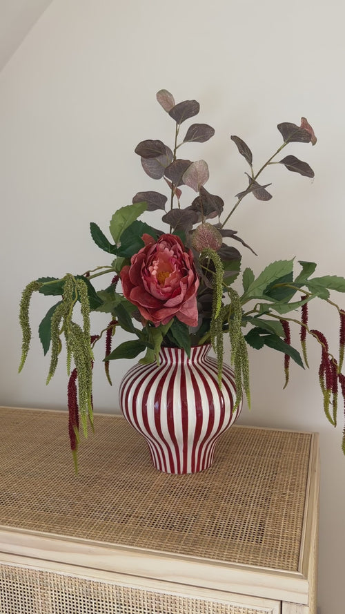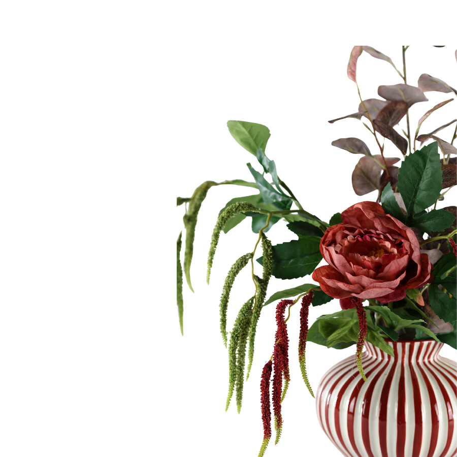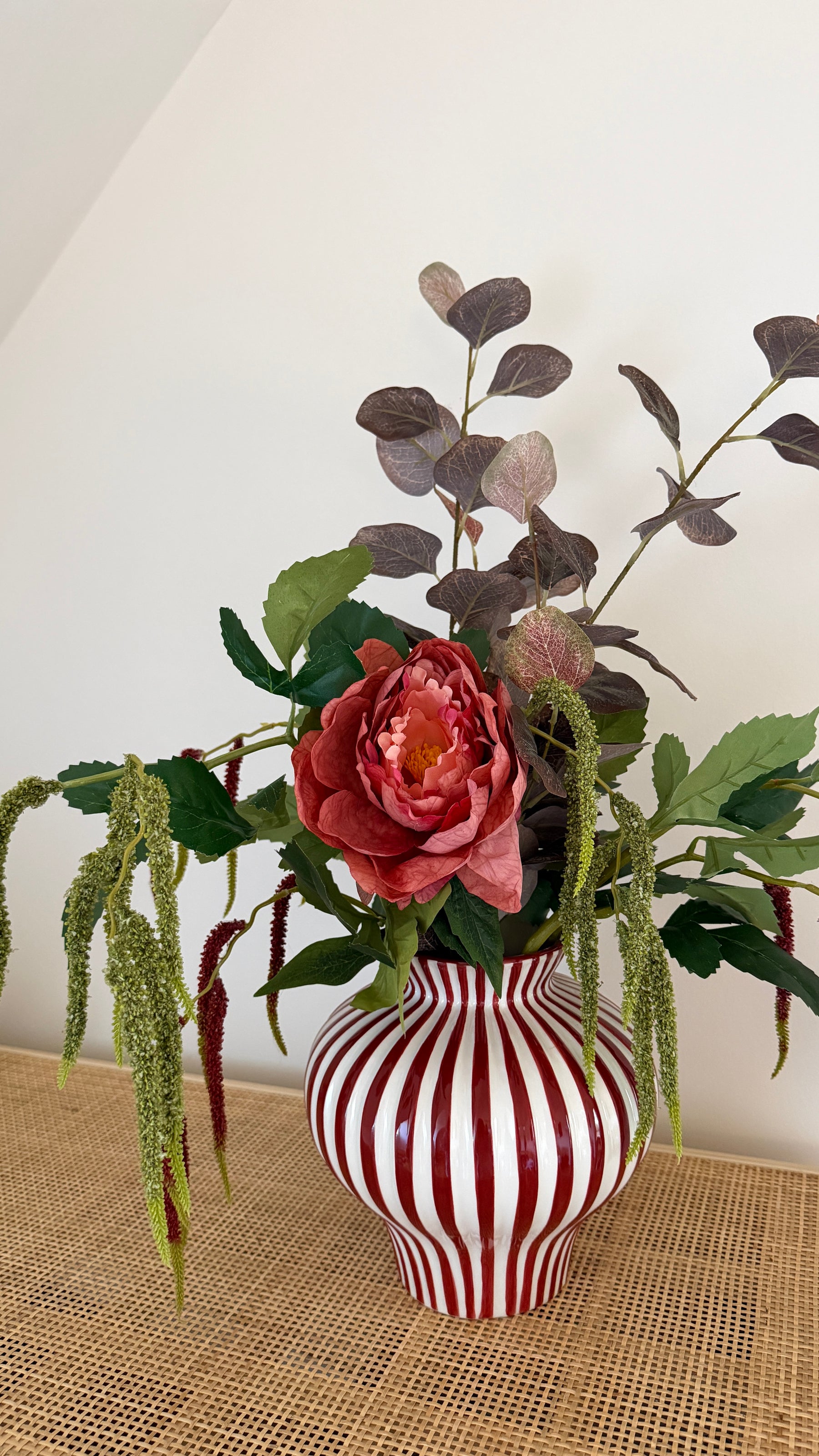 Evighedsbuket Efterårsglød m. Pæon og Røde Detaljer bringer et varmt udtryk ind i hjemmet. Den røde pæon står som bukettens midtpunkt, mens de brunlige eucalyptusgrene og røde græsstrå tilfører et efterårsagtigt præg. De grønne nuancer giver liv og balance, så buketten fremstår luksuriøs og harmonisk. Et smukt valg til spisebordet eller stuen, der holder sin form og farve år efter år.