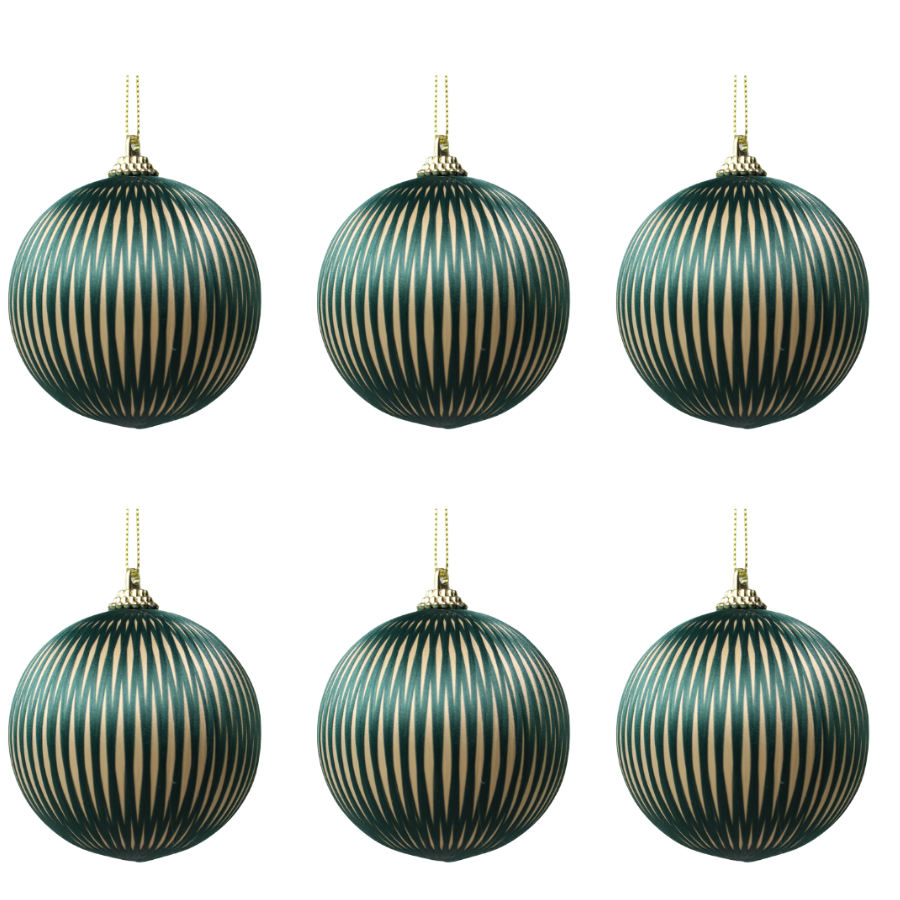 Julekugler GABRIEL i grøn bringer et elegant og moderne udtryk til juletræet. De har en smuk, stribet overflade med glansfuld finish, der fanger lyset og skaber en eksklusiv stemning i julepynten. Den dybe grønne farve kombineret med de gyldne detaljer giver et klassisk look, der passer til både traditionelle og moderne juletemaer. Et smukt sæt, der skaber harmoni og varme i din juleudsmykning år efter år.