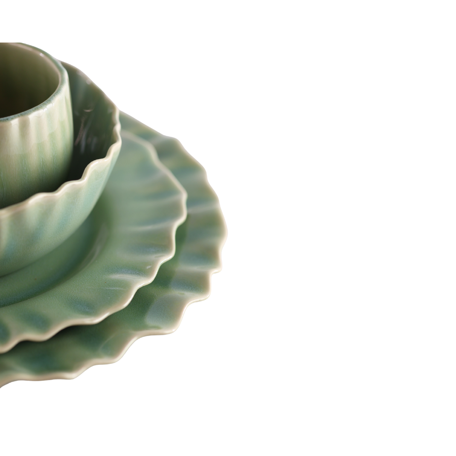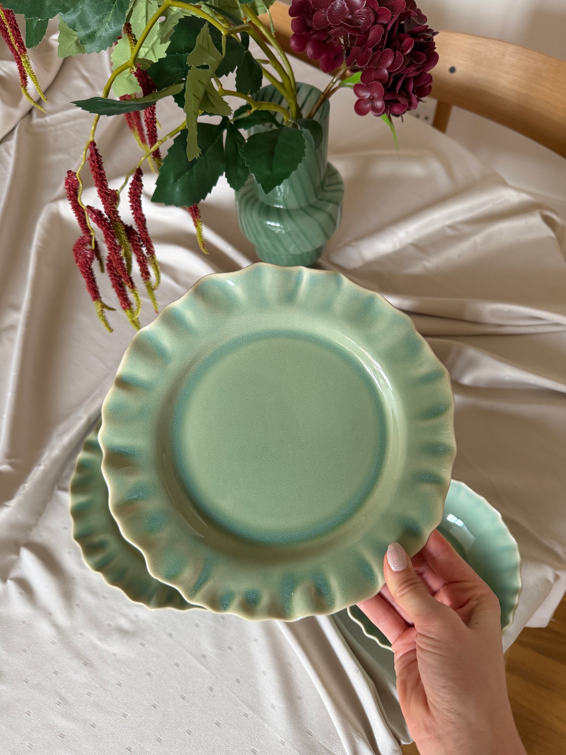 Disse frokosttallerkener i keramik er designet til at bringe et frisk pust til hverdagens måltider. Sættet består af seks tallerkener i en indbydende grøn nuance, der komplementerer en række borddækninger. Med deres enkle og rene design passer de smukt ind i det moderne hjem.