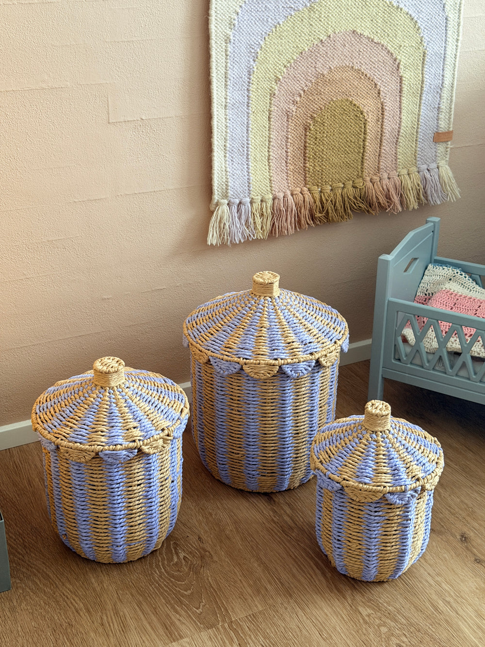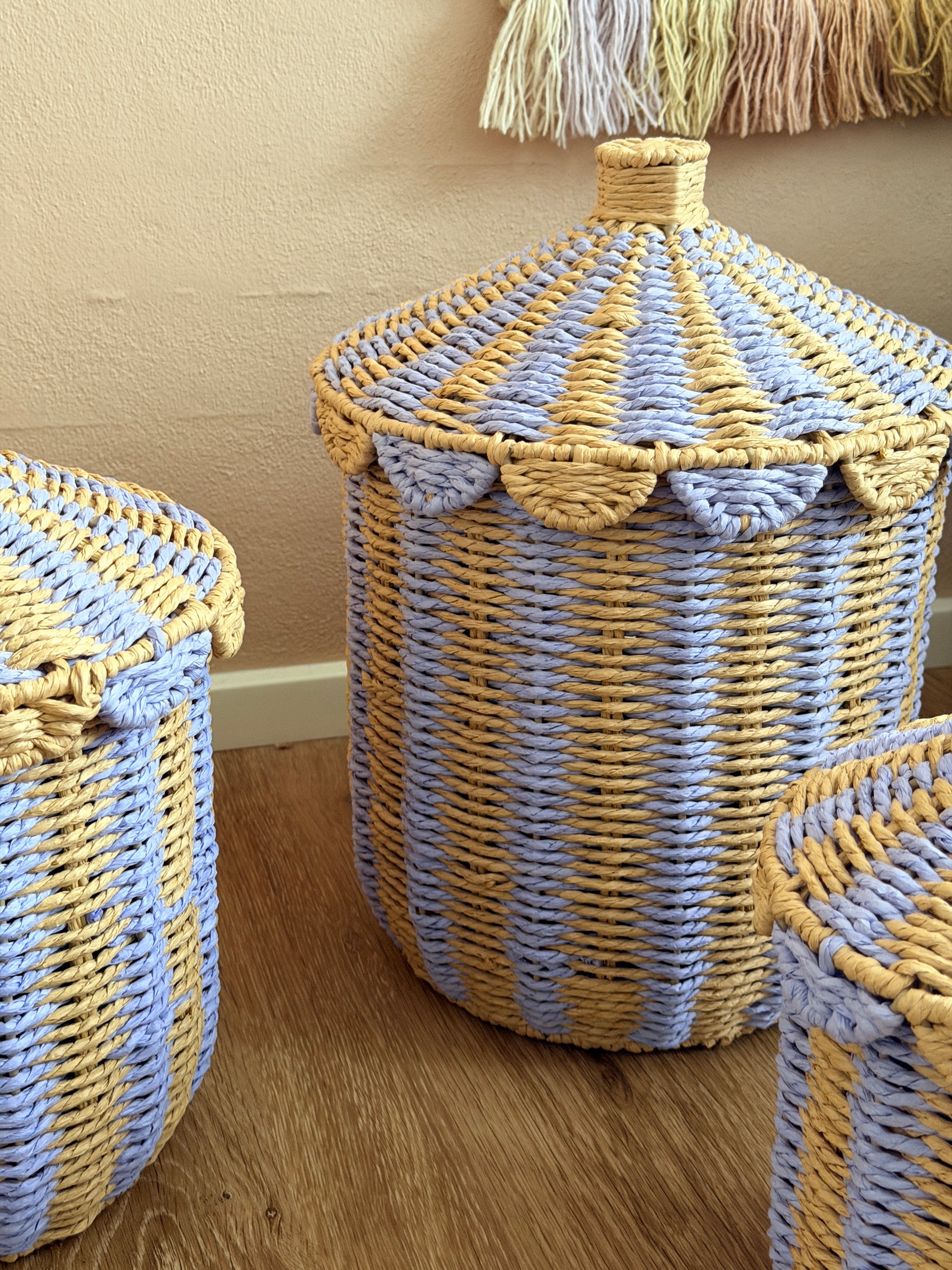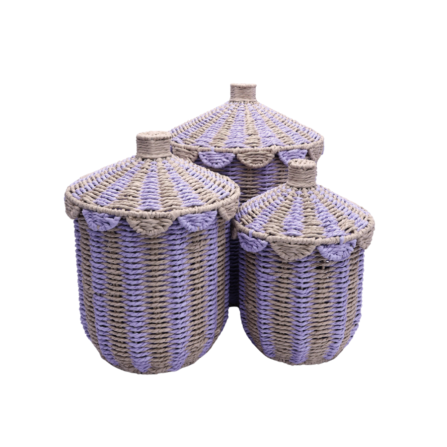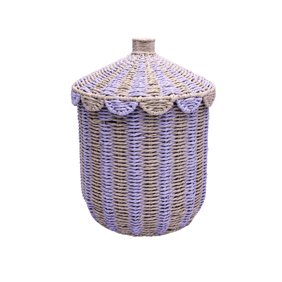 Med sin kombination af naturfarvede nuancer og et strejf af lilla, tilføjer kurven en diskret farveaccent til indretningen. Den kan placeres i stuen, soveværelset eller på kontoret for at samle tæpper, puder, magasiner eller legetøj.