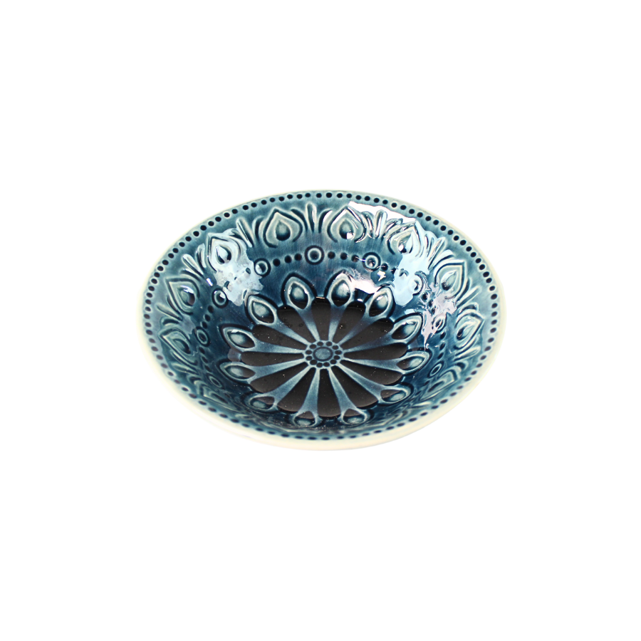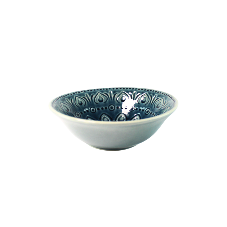 Smuk og dekorativ skål i blå nuancer fra serien Dicte. Skålen har et elegant reliefmønster på indersiden med en blank glasur, der giver et eksklusivt og håndlavet udtryk, mens ydersiden fremstår mere rolig og afdæmpet.
