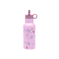 Sød og praktisk termoflaske til børn fra FRIO i en blød lyserød farve med hjerter og fine dyremotiver. Flasken rummer 400 ml og er designet i en børnevenlig størrelse, der er nem at holde og tage med i skoletasken eller på tur.
