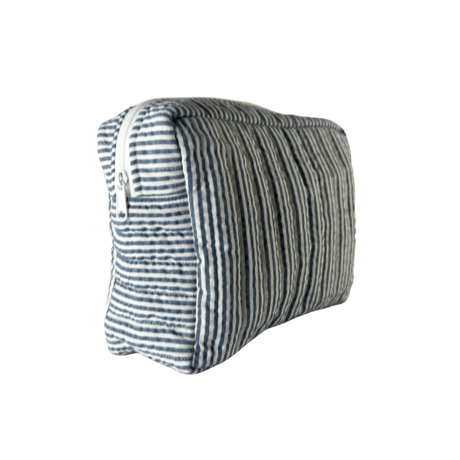 Toilettasker i Beige og Grå Stribe EASON har et enkelt udtryk, hvor de fine quiltede striber skaber en let og legende overflade. Med målene 27x10x20 cm tilbyder den god plads til makeup, plejeprodukter og andre småting. Lynlåsen gør tasken nem at åbne og lukke, og den faste form hjælper med at holde indholdet organiseret. En praktisk og ukompliceret toilettaske, der gør hverdagen lidt mere overskuelig.